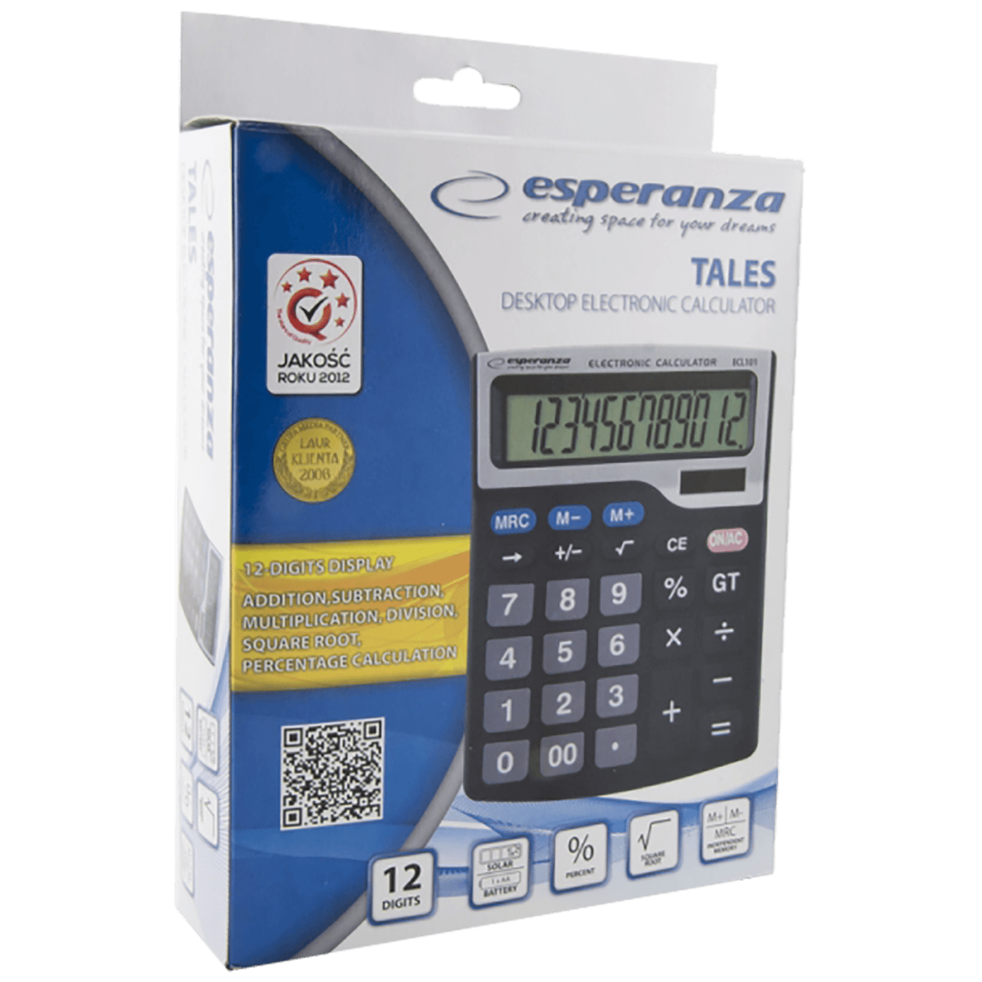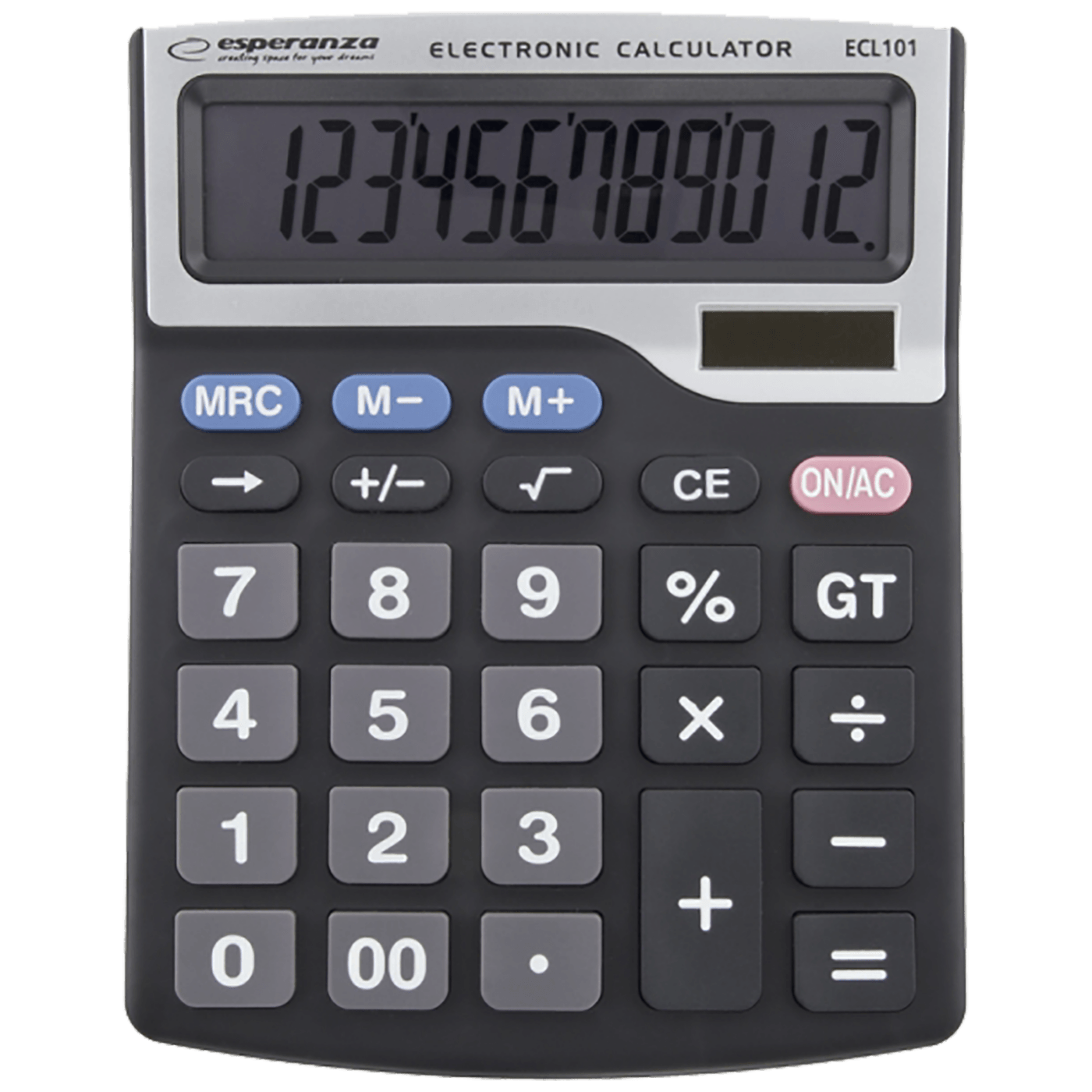 Stolni kalkulator s velikim 12-znamenkastim ekranom. Sadrži sve osnovne matematičke funkcije (sabiranje, oduzimanje, množenje, dijeljenje, kvadratni korijen, izračunavanje postotka), funkcija brisanja upisanih brojeve i mogućnost pohrane rezultata. Naslonjeni ekran, velike znamenke ekrana i velike tipke olakšavaju rad s kalkulatorom. Idealno za svakodnevnu upotrebu u trgovinama i uredima.