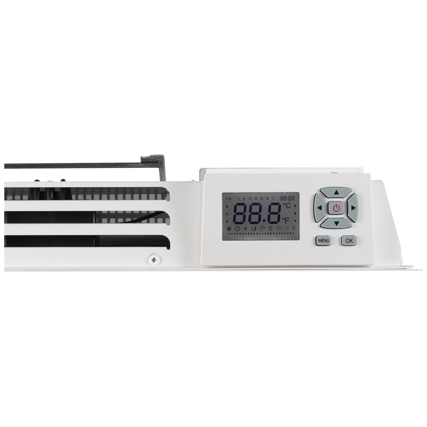 Zidna grijalica, snaga 590 – 700 W, LCD zaslon, linearno grijanje, ravnomjerna raspodjela topline, aluminijski grijaći element, elektronički termostat, podesiv raspon temperature 5 do 29 °C, tjedni program, funkcija zaštite od smrzavanja, detekcija otvorenog prozora