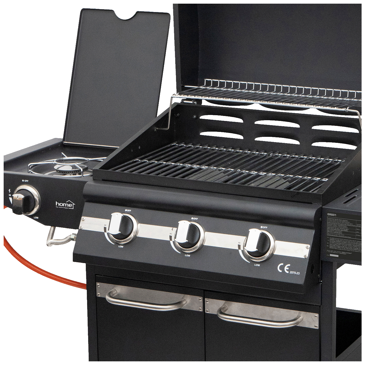 Plinski roštilj Home GRG01 idealan je izbor za one koji traže pouzdan, visokoučinkovit i jednostavan vanjski roštilj. Uređaj ima tri zasebno upravljiva glavna plamenika i praktičan bočni plamenik, tako da možete istovremeno pripremati nekoliko jela – bilo da se radi o mesu, povrću ili čak umacima. Čist dizajn, kućište od čelika s praškastim premazom i ugrađeni termometar ispunjavaju sve zahtjeve za elegantno i učinkovito vrtno roštiljanje.