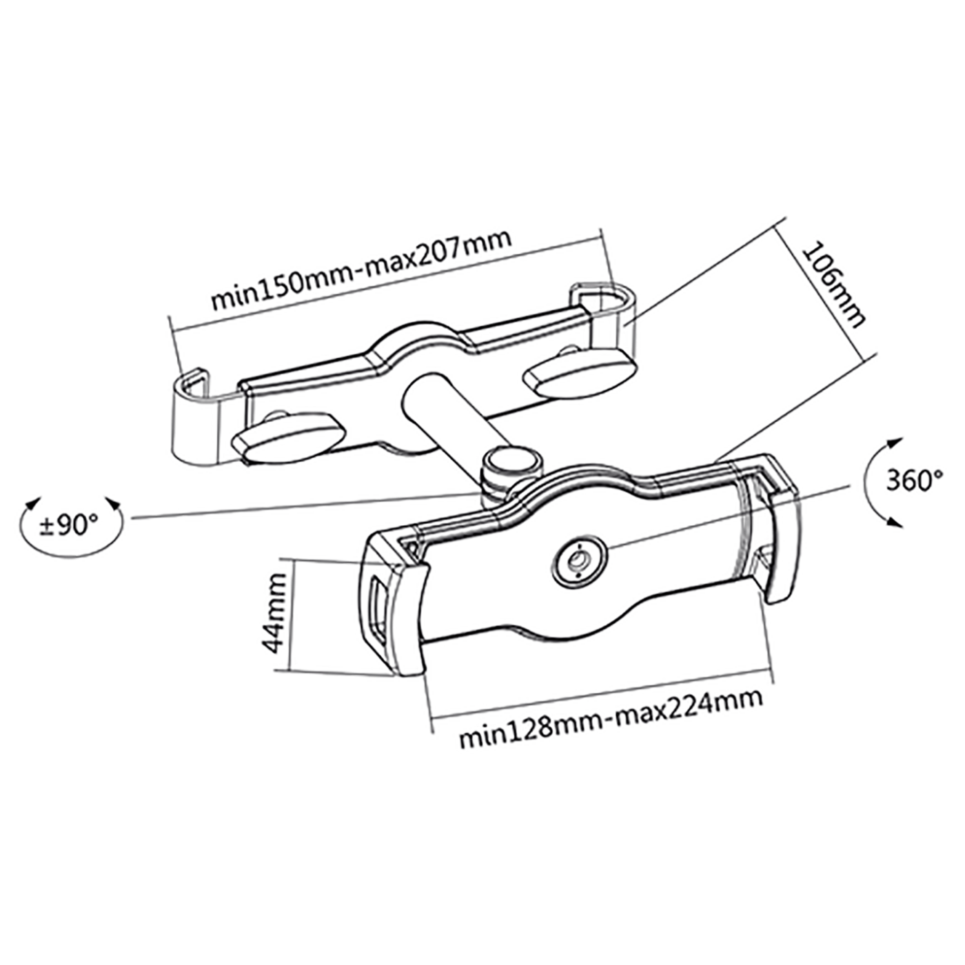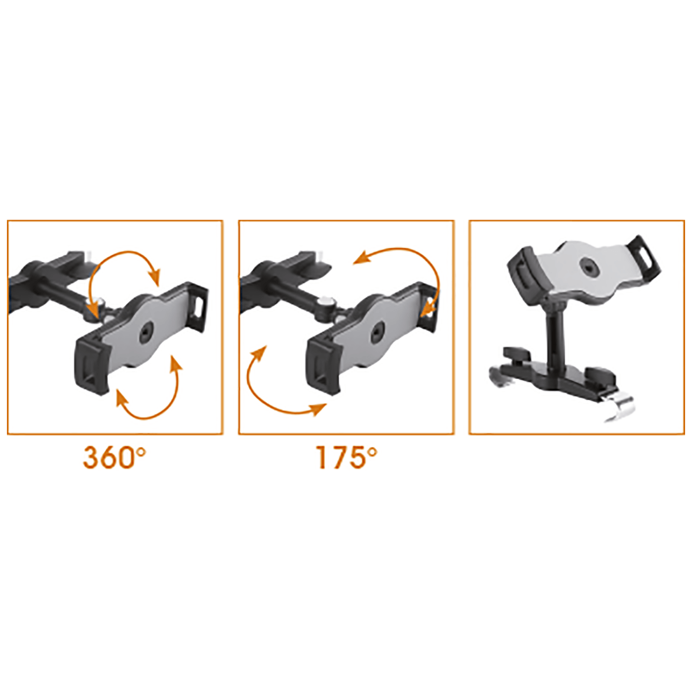 Auto nosač za tablet, 4.7” – 12.9”, montaža na naslonjač za glavu, nagib 175°, zakretanje 360°, raspon stezaljki 12.8 – 22.4 cm