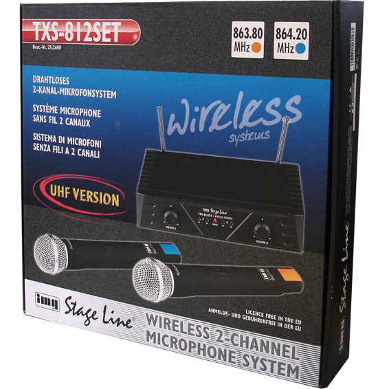 Set 2 bežična mikrofona i pojačalo, radna frekvencija 863,80MHz, 864,20 MHz, 40-15000 Hz, audio izlaz 0-200 mV /10 kiloOms (utičnica), 0-400 MV / 10 kiloOms XLR, domet 30 met, sučelje – jack utičnica x 1, XLR x 2. Dual channel UHF verzija s funkcijom prebacivanja kanala za miks volume i mute po kanalu. RF signal, zvučni i LED indikator za svaki kanal. Napajanje mikrofon 2 x 1,5V AA baterije, pojačalo AC adapter.