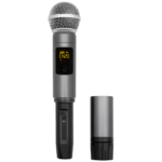 Bežični set, profesionalni mikrofon i prijemnik, višenamjenski digitalni zaslon na ručki, prikaz frekvencije / kanal / stanje baterije, digitalni filter šuma, automatsko uparivanje, 20 kanala koji se mogu odabrati za prijem bez smetnji, Ø6,3 mm priključak za mikrofon na prijemniku, punjivi prijemnik se može izravno priključiti na pojačalo, domet na otvorenom prostoru do 40 m, frekvencijski opseg 550-565,2 MHz, dimenzije mikrofona Ø50 / 33 x 240 mm, napajanje mikrofona 2 x AA (1,5 V) baterije, nisu uključene u pakiranje, diemezije prijemnika Ø80 x 42 x 17 mm, napajanje prijemnika ugrađena Li-Ion baterija 500 mAh, vrijeme punjenja / vrijeme rada cca 2,5 / 6 h, pribor kabel za punjenje USB – microUSB (1.0 m)