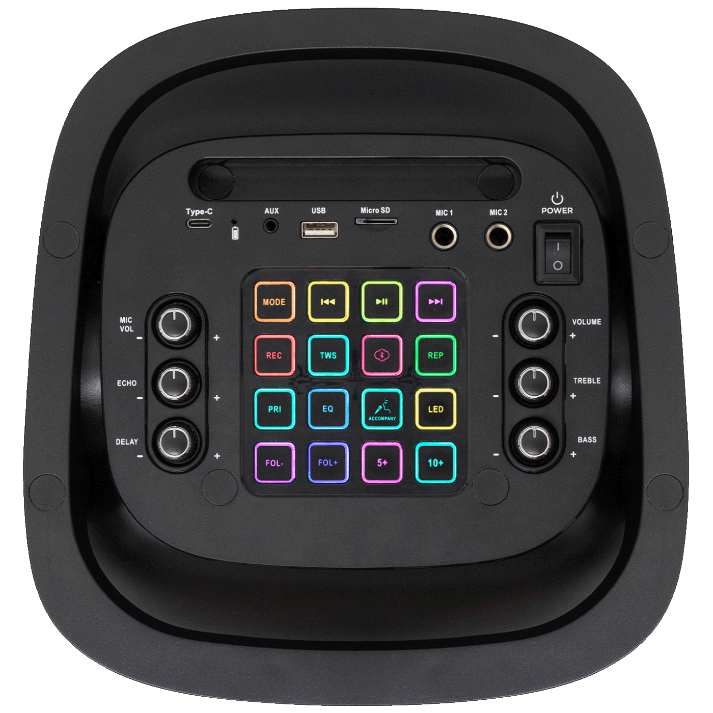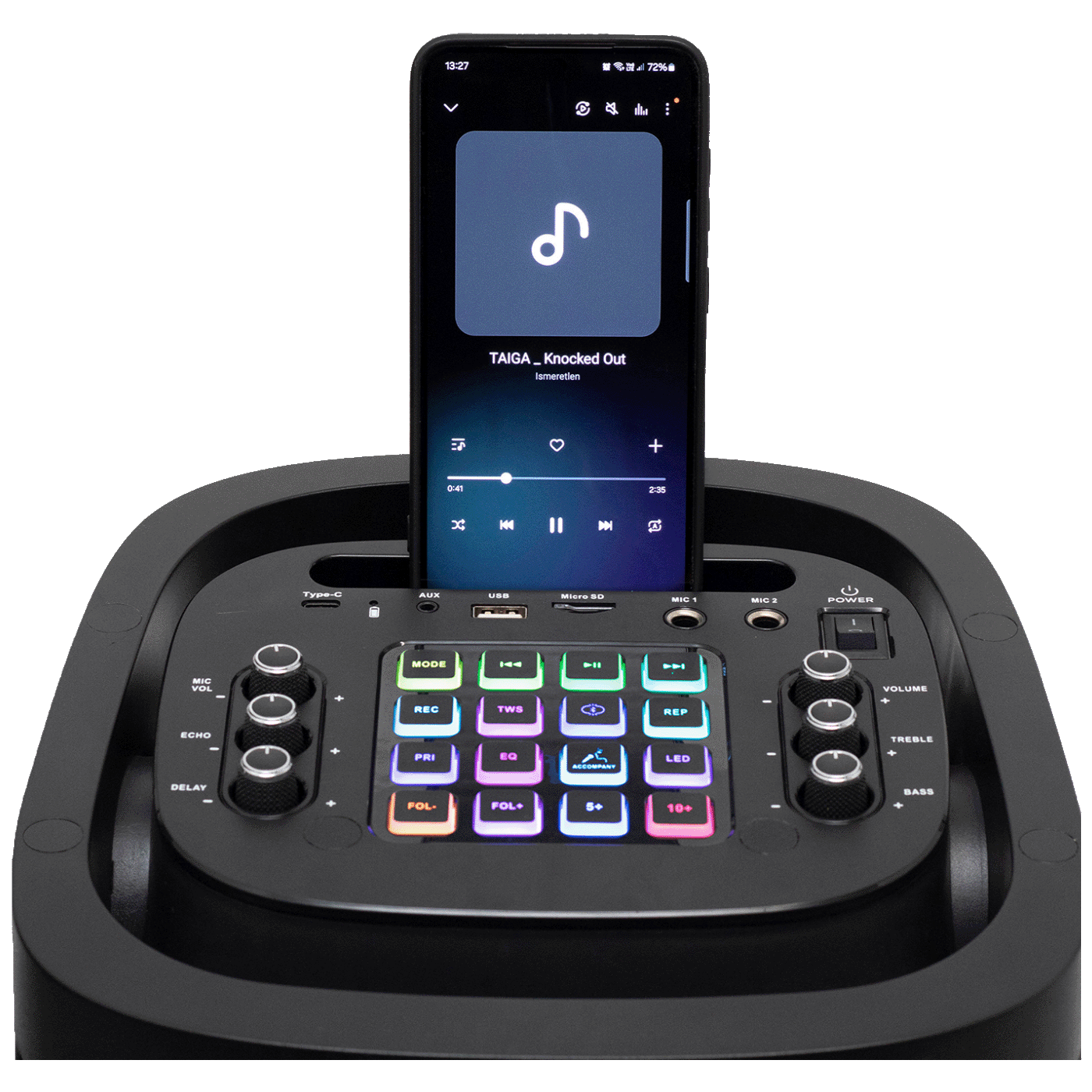 Dva priključka mikrofona pružaju mogućnost zajedničkog pjevanja ili čak sudjelovanja u karaoke natjecanju. Funkcija echo stvara profesionalni učinak, dok funkcija KARAOKE potiskuje izvorni glas pjevača, tako da korisnici mogu uživati ​​u vlastitoj izvedbi. Osim toga, zvuk s mikrofona može se snimiti na USB/microSD pohranu, tako da kasnije možete slušati nezaboravne trenutke.