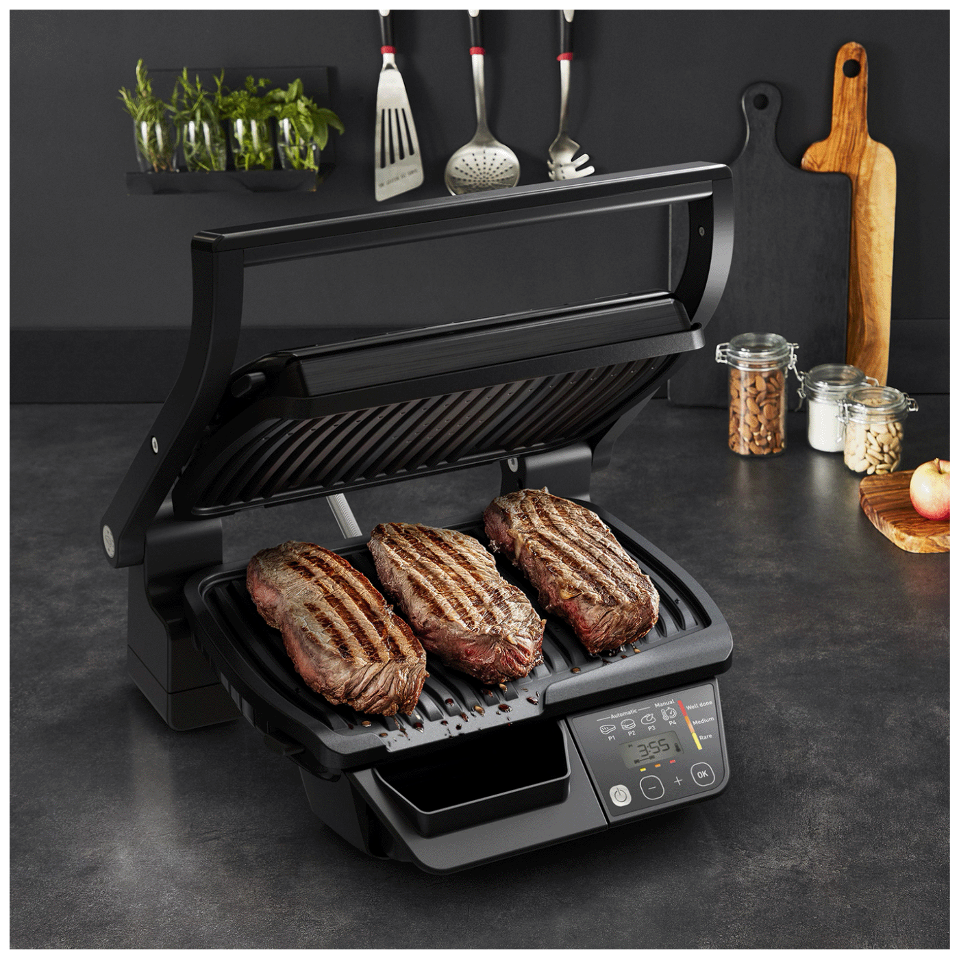 OptiGrill mjeri debljinu mesa do milimetra, uzima u obzir broj porcija i automatski prilagođava vrijeme kuhanja kako bi garantirao savršene rezultate, od slabo do dobro pečenog!