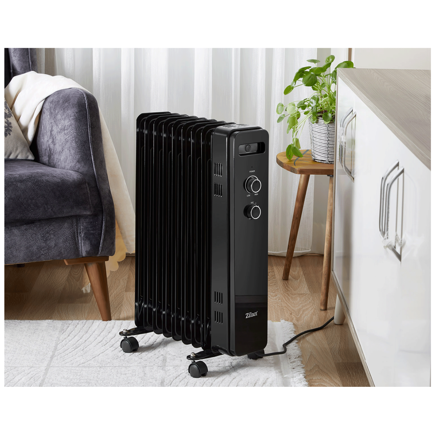 Zilan ZLN8443 je moćan uljni radijator namijenjen zagrijavanju većih prostorija — spaja snagu i sigurnost uz praktičnost prijenosnog dizajna.